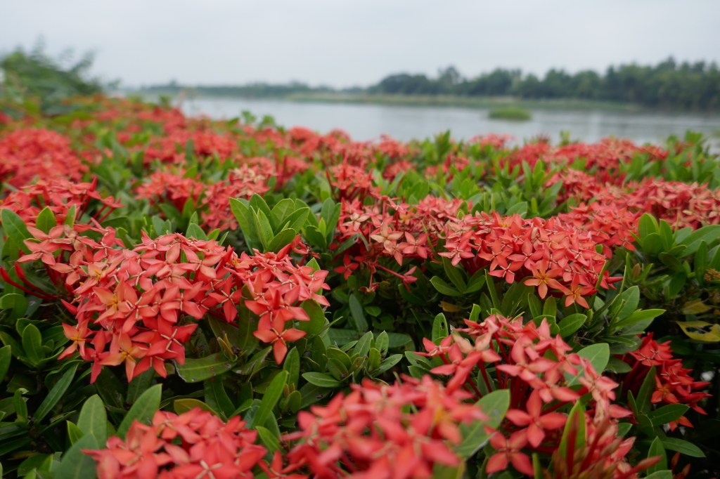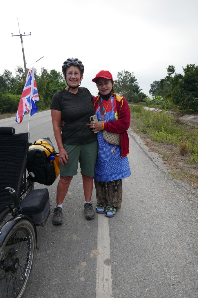 The morning started along the small roads weaving along the south bank of the river Ping. After a few kms a car pulled over and a woman jumped out waving at us. Wondering what we had done wrong, but she was just being kind and handed over a bag of food with lots of bowing and words that we interpreted as welcome to Thailand. We passed fields of rice in various stages of planting, sugar cane, cassava, oranges and other things we could not recognise.