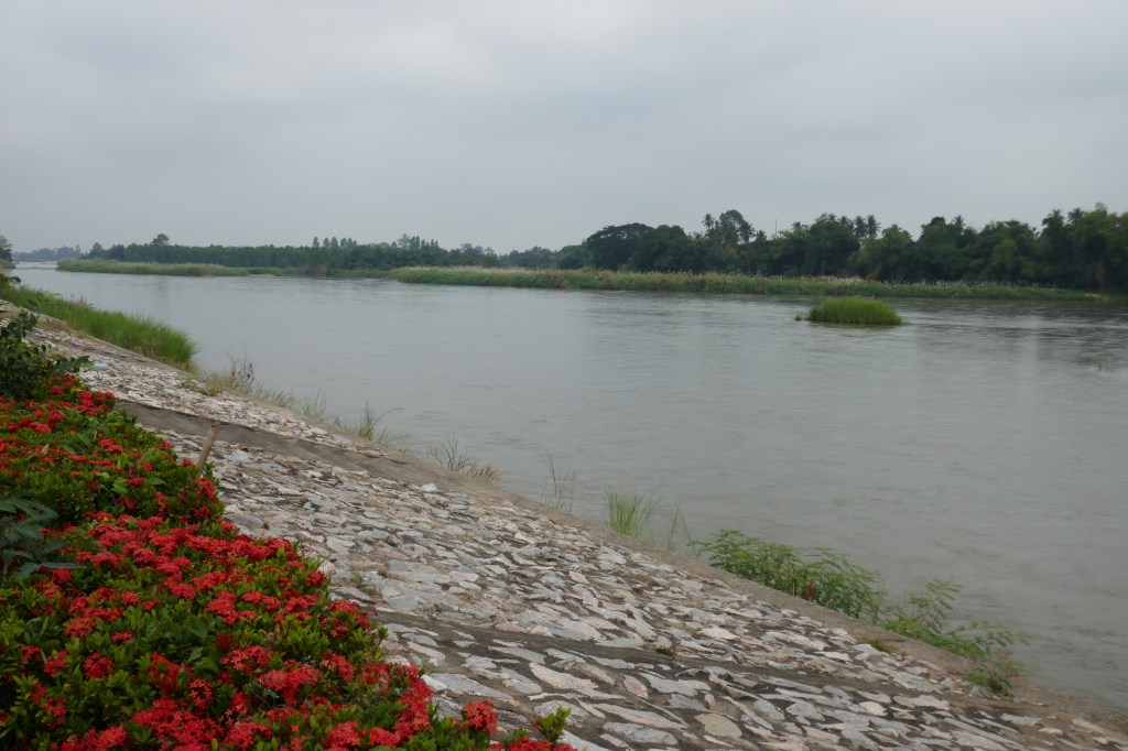 30km (at least on the flat) is about our ideal time for a stop. By that point we got to the town of Khlong Khlung and found a smart cafe which did excellent coffee. After this we fairly zoomed off; driven by cafine. Soon though the choice of small roads disappeared. We crossed the bridge to the north side to avoid the main highway 1 but the road we had to join proved to be quite busy. This side of the river was much more industrialised, and we passed huge factories and a massive plant for processing sugar cane. It belched out huge amounts of smoke, which did not help the air quality.