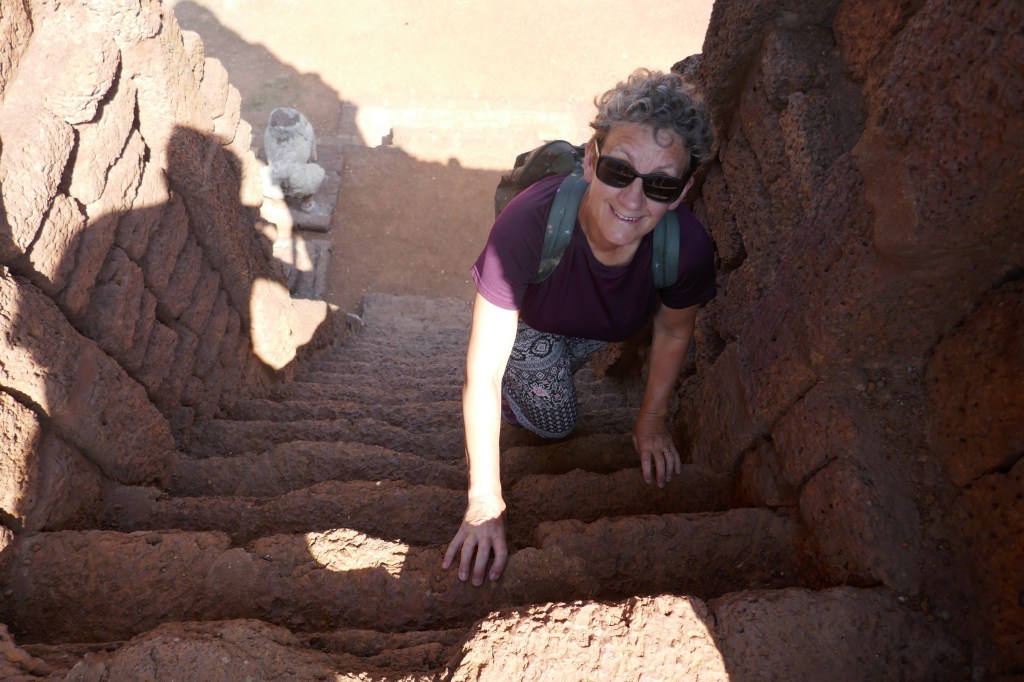 The KP Historical Park is over two sections.  The first involved a walk around an area of temples, Budda statues (both upright and reclining) and lots of chedi (closely related to “stupas” which we have seen in other places – the pointy up bits).  The buildings were made of laterite rock – a hard, reddish volcanic rock with holes like Dutch cheese.  There is extensive evidence of fire damage and all of the roofs of the buildings have fallen in, but the remaining stones are hugely evocative of a sophisticated civilisation.  The rest of the description is far better shown in photos than in text – so this posting is more pictures than words.