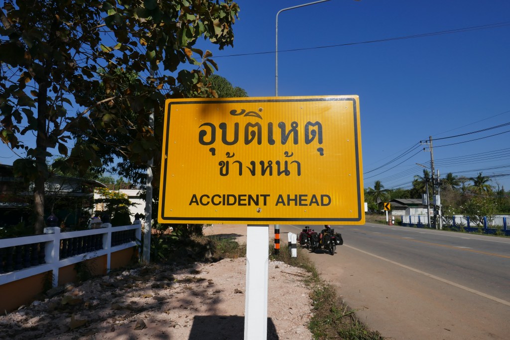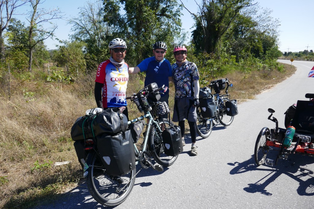 The road bent away from the river for a short distance and on this stretch we saw some touring cyclists coming towards us up the hill towards us. They were a couple of young, male Thai touring cyclists and were on their way south. They were well kitted out with ortleib panniers, brooks saddles and surly long haul trucker touring bikes – in fact our exact set up before we switched to trikes. Their English and our Thai was minimal so we just did ‘bike talk’ with pointing, took some pictures, said good luck and on our way again. They were closely followed by two further cyclists – clearly part of the same group.