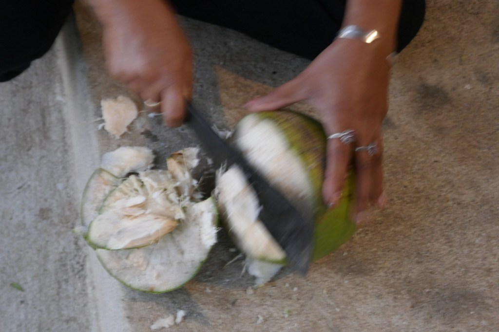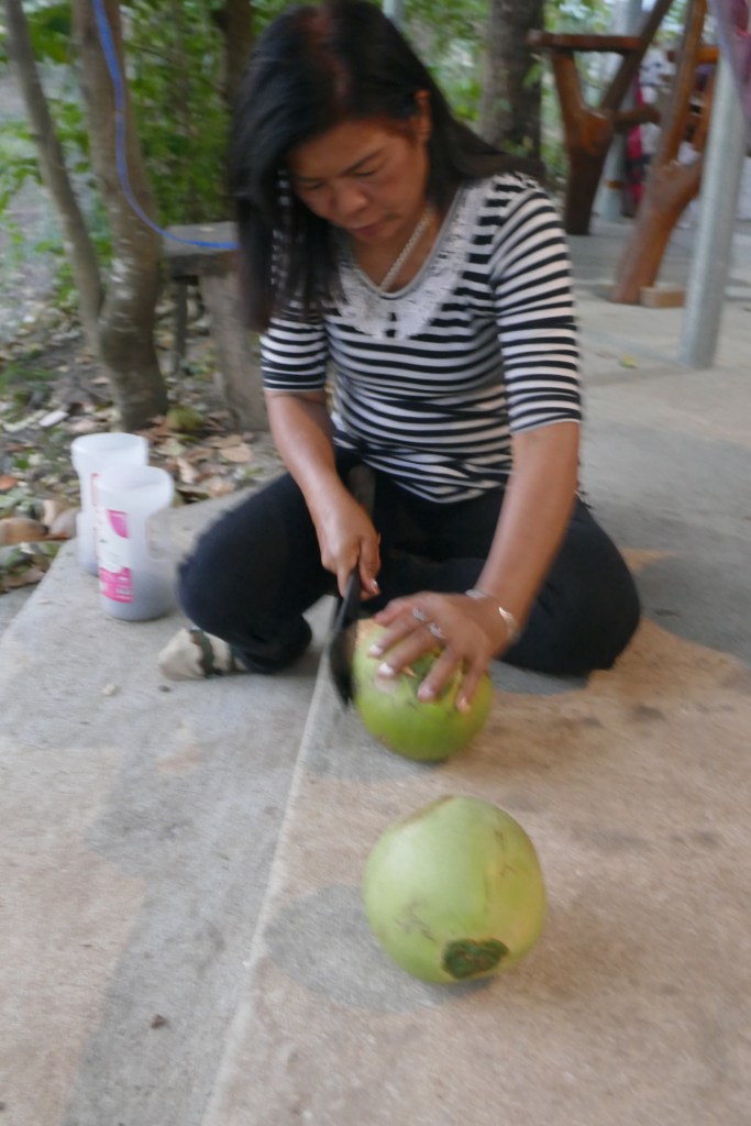 I am typing this under a shelter near a fish pool, in the company of Uwe and Nok, with a view of hills around three sides whilst we wait for the barbecue to cook.  Uwe and Nok are our Warmshowers hosts who have kindly offered a bed for the night to two passing cyclists.  The food was delicious, the company excellent and we learned not to feed fish to turkeys and how to cut open a coconut with a machete.  Both of which will be useful to know back in Shropshire.