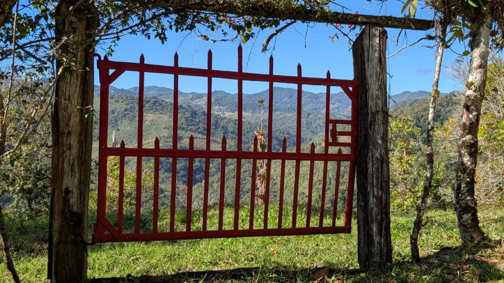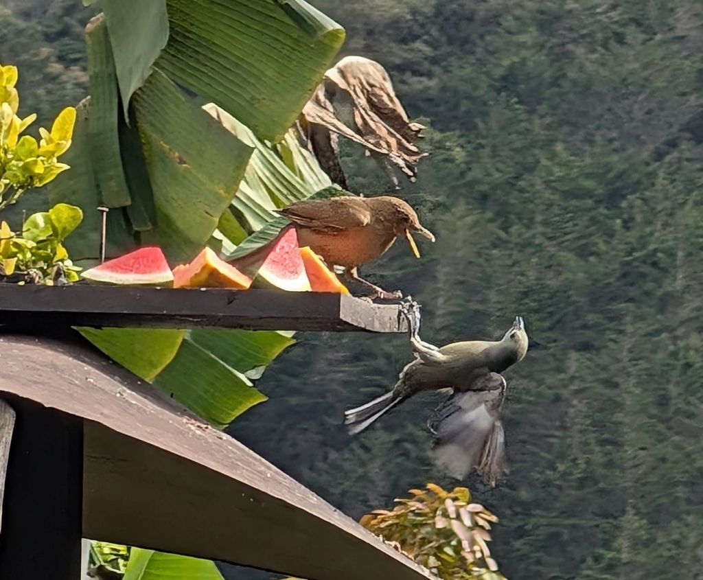 David was doing pretty well and making excellent progress, even chatting with fellow trekkers as we climbed. Eventually we got to the top and started the descent. Large houses started to appear on both sides of the road. This is an affluent area with “farms” for the wealthy from Cartago. We stopped at a cafe for a coffee and then ambled downhill to the guesthouse where we were stopping for the night. This is a delightful venue, run by some Columbians set in a beautiful garden and surrounded by a forested hillsides. By this stage David’s head was spinning a bit but he revived after lying down. Then we spent a relaxing afternoon in the garden, watching the birds and reading.