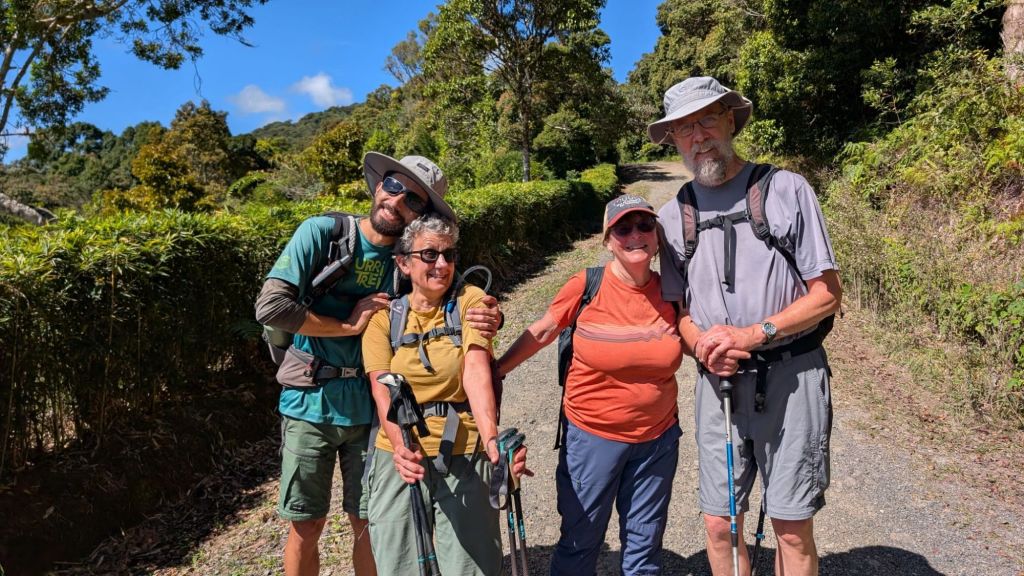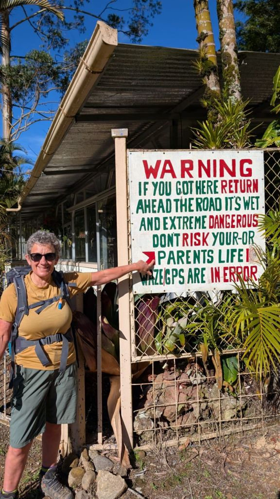 Today was Sunday and our route took us just south of the city of Cartago, a city of 170,000 people, with the shrine of the Black Madonna (which we did not visit). This is a prosperous area and almost everyone from the city seemed to be out on bikes or walking in the sunshine this morning. We took a short bus ride from our hotel to the village of Muneco and then started a walk which Jairo had warned would be steeply up. He was not joking – although this was a “road”, there was a warning sign at the bottom advising people in colourful language (and in English) not to use it for vehicles and we soon saw why.