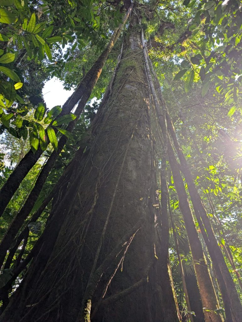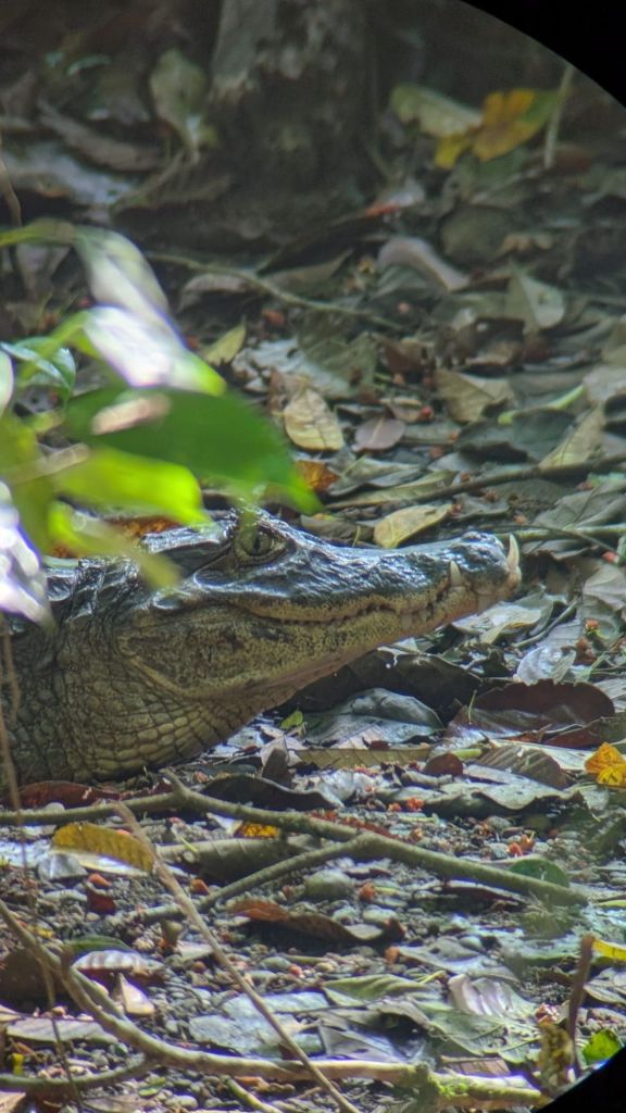8.30 saw the start of the day’s main hike – this time in primary forest (ie forest that has never been cut down or planted by humans). This was much denser forest, with a huge variety of trees and other plants – and a very muddy trail. Near the start we watched a stationary Caiman – a “small” form of crocodile but still over a metre long. This is croc-country and swimming in the creeks is discouraged for obvious reasons.