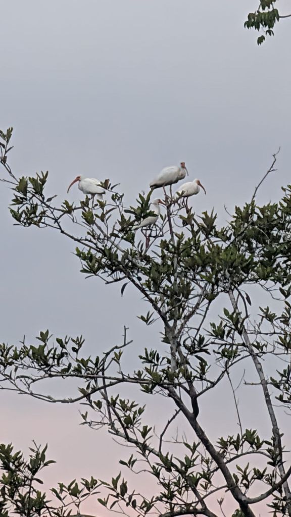 We watched the sun go down over the water and saw spoonbills and white ibis wading in the water and ‘formation flying’ from flocks of pelicans. Then we ambled back to the ranger station in the encircling gloom. Supper was ready when we got back and we were in bed by 7.30pm, with all the centre lights going out at 8.