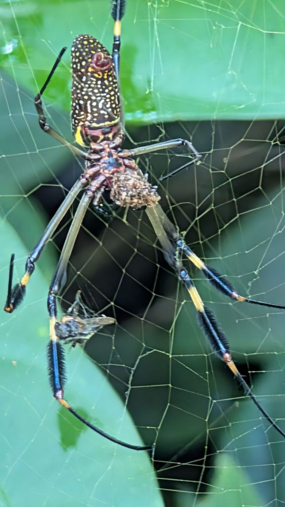 Wildlife sightings in primary forest are much less frequent because of the density of the flora but we still saw squirrel monkeys, several birds, including woodpeckers and hummingbirds, a beautiful golden orb spider on a web and a less beautiful tarantula deep within a hollow tree trunk (thank goodness). Fraser was a fount of knowledge about the vegetation and trees. In the secondary forest, the fast growing Ficus (Fig) species have grown into large trees over the 50 years sine the start of the national park but in the primary forest we saw 1000 year old Espavales trees – often entwinned with huge giant Ficus vines that were almost as old.